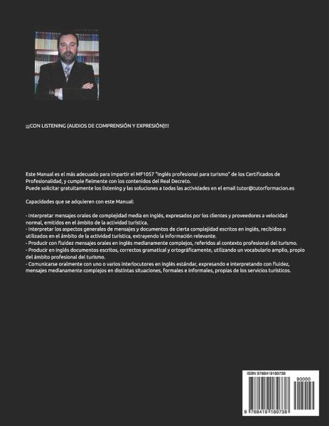 ¡¡¡CON LISTENING (AUDIOS DE COMPRENSIÓN Y EXPRESIÓN)!!! Este Manual es el más adecuado para impartir el MF1057 "Inglés profesional para turismo" de los Certificados de Profesionalidad, y cumple fielmente con los contenidos del Real Decreto. >Capacidades que se adquieren con este Manual: - Interpretar mensajes orales de complejidad media en inglés, expresados por los clientes y proveedores a velocidad normal, emitidos en el ámbito de la actividad turística. - Interpretar los aspectos generales de mensajes y documentos de cierta complejidad escritos en inglés, recibidos o utilizados en el ámbito de la actividad turística, extrayendo la información relevante. - Producir con fluidez mensajes orales en inglés medianamente complejos, referidos al contexto profesional del turismo. - Producir en inglés documentos escritos, correctos gramatical y ortográficamente, utilizando un vocabulario amplio, propio del ámbito profesional del turismo. - Comunicarse oralmente con uno o varios interlocutores en inglés estándar, expresando e interpretando con fluidez, mensajes medianamente complejos en distintas situaciones, formales e informales, propias de los servicios turísticos.