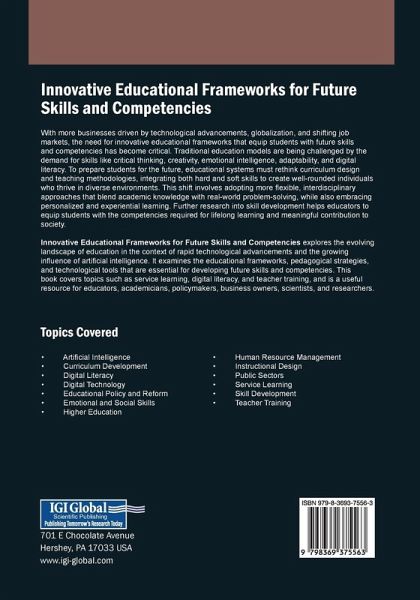 With more businesses driven by technological advancements, globalization, and shifting job markets, the need for innovative educational frameworks that equip students with future skills and competencies has become critical. Traditional education models are being challenged by the demand for skills like critical thinking, creativity, emotional intelligence, adaptability, and digital literacy. To prepare students for the future, educational systems must rethink curriculum design and teaching methodologies, integrating both hard and soft skills to create well-rounded individuals who thrive in diverse environments. This shift involves adopting more flexible, interdisciplinary approaches that blend academic knowledge with real-world problem-solving, while also embracing personalized and experiential learning. Further research into skill development helps educators to equip students with the competencies required for lifelong learning and meaningful contribution to society. Innovative Educational Frameworks for Future Skills and Competencies explores the evolving landscape of education in the context of rapid technological advancements and the growing influence of artificial intelligence. It examines the educational frameworks, pedagogical strategies, and technological tools that are essential for developing future skills and competencies. This book covers topics such as service learning, digital literacy, and teacher training, and is a useful resource for educators, academicians, policymakers, business owners, scientists, and researchers.