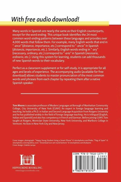 Many words in Spanish are nearly the same as their English counterparts, except for the word ending. This unique book identifies the 24 most common word-ending patterns between these languages and provides over 4,000 words that follow them. For example, many English words that end in "-ance" (distance, importance, etc.) correspond to "-ancia" in Spanish (distancia, importancia, etc.). Similarly, English words ending in "-ary" (necessary, ordinary, etc.) correspond to"-ario" in Spanish (necessario, ordinario, etc.). Using this system for learning, students can add thousands of new Spanish words to their vocabulary.