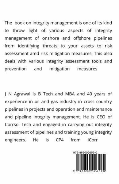 This book has been written by me based on my experience in pipeline integrity management for more than 39 years in oil and gas industry in India. I have worked in projects, construction, inspection, operation and maintenance, quality control and audit in oil and gas cross country pipeline. As a consultant in post-retirement period of 6 years, I have carried out pipeline integrity assessments of onshore and offshore pipelines together with prediction of fitness and residual life of pipelines suggesting mitigation measures. In addition, I have also trained integrity engineers. This book discusses important topics related to pipeline integrity such as integrity management process, threats to pipeline integrity and its assessment, Integrity assessment, tools for integrity assessment and its data analysis, in line inspection, External corrosion and internal corrosion direct assessment, corrosion monitoring, residual life assessment and fitness for purpose, mitigation, intervention and repair etc. Case studies and quiz test have also been included in this book for understanding and testing knowledge of the subject. I hope that the book will be very useful for asset integrity managers looking after asset integrity and provide inputs for taking decisions in carrying out integrity assessment and taking corrective measures.