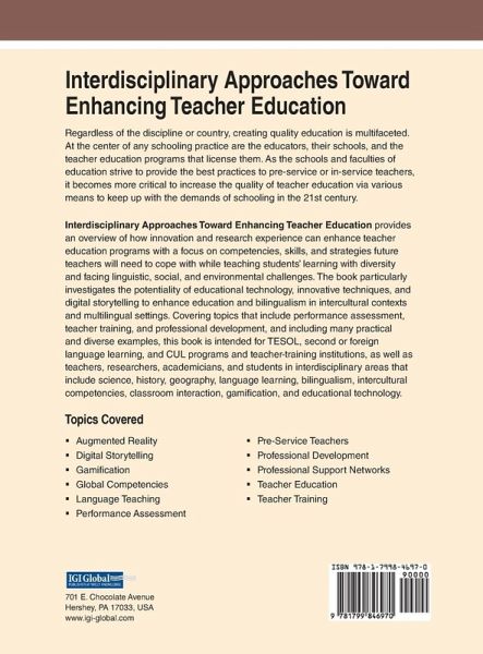 Regardless of the discipline or country, creating quality education is multifaceted. At the center of any schooling practice are the educators, their schools, and the teacher education programs that license them. As the schools and faculties of education strive to provide the best practices to pre-service or in-service teachers, it becomes more critical to increase the quality of teacher education via various means to keep up with the demands of schooling in the 21st century. Interdisciplinary Approaches Toward Enhancing Teacher Education provides an overview of how innovation and research experience can enhance teacher education programs with a focus on competencies, skills, and strategies future teachers will need to cope with while teaching students' learning with diversity and facing linguistic, social, and environmental challenges. The book particularly investigates the potentiality of educational technology, innovative techniques, and digital storytelling to enhance education and bilingualism in intercultural contexts and multilingual settings. Covering topics that include performance assessment, teacher training, and professional development, and including many practical and diverse examples, this book is intended for TESOL, second or foreign language learning, and CUL programs and teacher-training institutions, as well as teachers, researchers, academicians, and students in interdisciplinary areas that include science, history, geography, language learning, bilingualism, intercultural competencies, classroom interaction, gamification, and educational technology.