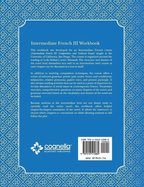 This workbook was developed for an intermediate French taught at the University of California, San Diego. The course is organized around the reading of Leila Sebbar’s novel Sherazade. The structure and themes of the novel lend themselves very well to an intermediate level course as each chapter can be discussed as a text in itself. In addition to teaching composition techniques, the course offers a review of selected grammar points: past tenses, future and conditional, subjunctive, relative pronouns, passive voice, and present participle. It also stresses reading activities that can be used as a point of departure for in-class discussions of social issues in contemporary France. Vocabulary exercises, comprehension questions on many chapters of the novel, and grammar exercises based on the vocabulary and themes of the novel are included. Because students at the intermediate level are not always ready to carefully read the entire novel, the workbook offers helpful chapter-by-chapter summaries of the novel. It allows the instructor to choose which chapters to concentrate on while allowing students to still follow the plot. Catherine Ploye is a lecturer in the Department of Literature at the University of California, San Diego. She earned her Ph.D. from the University of Wisconsin, Madison and won the Academic Senate Distinguished Teaching Award in 2011.