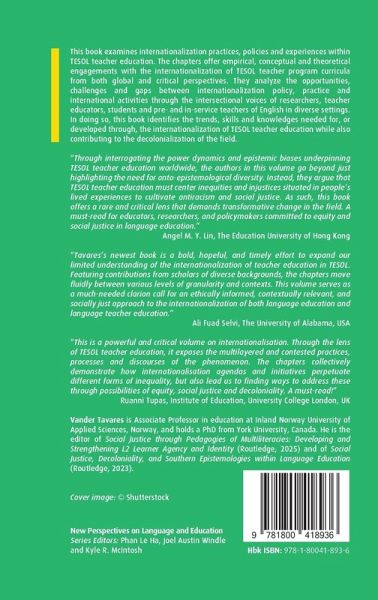 This book examines internationalization practices, policies and experiences within TESOL teacher education. The chapters offer empirical, conceptual and theoretical engagements with the internationalization of TESOL teacher program curricula from both global and critical perspectives.