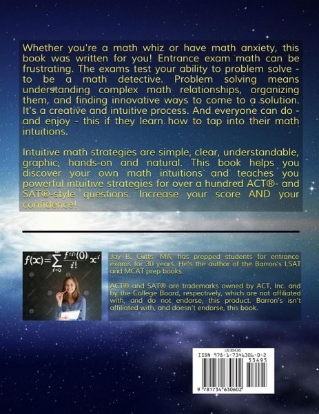 This book is for anyone who struggles with math and anyone who is curious about math intuitions, whether or not you are studying for an entrance exam for college or graduate school. Math on the college entrance exams can be frustrating - whether a student is a math whiz or has math anxiety. Why?These exams are not - fundamentally - testing math facts and processes. They are testing your ability to do complex math problem solving - your ability to be a math detective. Math problem solving is the ability to understand complex math relationships, organize them, and find innovative ways to come to a solution. It's a creative and intuitive process. And everyone has the ability to do this - and actually enjoy it - if they learn how to tap into their math intuitions and study a broad range of intuitive tools. Intuitive math strategies are simple, clear, understandable, graphic, hands-on, and natural. The heart of intuitive math problem solving is to find strategies that make complete sense to you. This book introduces students to intuitive math, helps them discover their own math intuitions, and clearly demonstrates powerful intuitive strategies for over a hundred ACT®- and SAT®-style math questions. In addition the book gives critical insights into how to avoid the common time management errors on the test and to quickly increase your score through highly efficient timing strategies. Many students get the score they need through mastering timing strategy alone! After studying this book, students who are strong in math will be able to solve questions more quickly and more accurately - for a significant increase in their score. Students who are not comfortable with math or who have math anxiety will be able to understand complex math questions, organize them, and quickly find the solution, using tools that make sense to them. Their score will increase significantly and so will their confidence! And they may well leave math anxiety behind them. For people who struggle with math, this book teaches you powerful intuitive strategies for organizing many kinds of math patterns, using easy-to-understand practice questions. If you go through the book patiently, you'll find that you are no longer intimidated by math that you run into in your daily life or your work. ACT® and SAT® are trademarks registered by ACT, Inc. and by the College Board, respectively, which are not affiliated with, and do not endorse, this product.