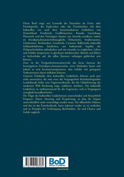 Dieses Buch zeigt, wie Lernende des Deutschen als Zweit- oder Fremdsprache, des Englischen oder des Französischen sich dem kulturellen wie auch dem kommunikativen Gedächtnis von Deutschland, Frankreich, Großbritannien, Kanada, Luxemburg, Österreich und den Vereinigten Staaten von Amerika annähern, indem sie fremdsprachenunterrichtstaugliche Dokumente, Straßennamen, Schulnamen, Briefmarken, Leserbriefe, Cartoons, Belletristik, kulturelle Schlüsselerlebnisse, bearbeiten, um bedeutende Aspekte der Zielsprachenkultur aufzudecken und mit einander zu vergleichen. Lehrer und Schüler kooperieren in gleichsam detektivischer Absicht und klären so Sachverhalte auf, die selbst Kennern verborgen geblieben sein können.Zwar ist der Fortgeschrittenenunterricht der locus classicus des Investigativen Fremdsprachenunterrichts, seine Methoden lassen sich jedoch so weit heruntertransponieren, dass Schüler mit geringeren Vorkenntnissen daran teilhaben können.Unserem Zielobjekt, dem kulturellen Gedächtnis, können auch jene nicht ausweichen, die statt einer die Vergangenheit berücksichtigenden Landeskunde lieber eine Gegenwartskunde, die der Globalisierung der modernen Welt Rechnung trägt, etablieren möchten. Das kulturelle Gedächtnis ist mitbestimmend für die Gegenwart, weil es Vergangenes zwanghaft heraufbeschwört.Die Träger des kulturellen Gedächtnisses unterscheiden sich hinsichtlich Frequenz, Dauer, Streuung und Kryptierung, so dass ihr Impact unterschiedlich stark veranschlagt werden muss. Der öffentliche Diskurs, und das ist das Entscheidende, kann jederzeit wieder an sie andocken und so Perioden der Verdrängung überbrücken. Sie sind Chance und Gefahr zugleich.