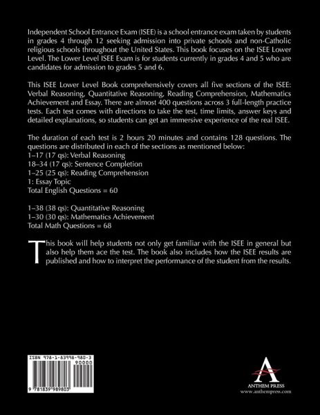 Independent School Entrance Exam (ISEE) is a school entrance exam taken by students in grades 4 through 12 seeking admission into private schools and non-Catholic religious schools throughout the United States. This book focuses on the ISEE Lower Level. The Lower Level ISEE Exam is for students currently in grades 4 and 5 who are candidates for admission to grades 5 and 6. This ISEE Lower Level Book comprehensively covers all the five sections of the ISEE: Verbal Reasoning, Quantitative Reasoning, Reading Comprehension, Mathematics Achievement and Essay. There are almost 400 questions across 3 full-length practice tests. Each test comes with directions to take the test, time limits, answer keys and detailed explanations, so students can get an immersive experience of the real ISEE. The duration of each test is 2 hours 20 minutes and contains 128 questions. The questions are distributed in each of the sections as mentioned below: 1-17 (17 qs): Verbal Reasoning 18-34 (17 qs): Sentence Completion 1-25 (25 qs): Reading Comprehension 1: Essay Topic Total English Questions = 60 1-38 (38 qs): Quantitative Reasoning 1-30 (30 qs): Mathematics Achievement Total Math Questions = 68 This book will help students not only get familiar with the ISEE in general, but also help them ace the test. The book also includes how the ISEE results are published and how to interpret the performance of the student from the results.