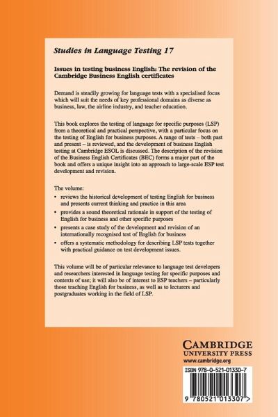 Demand is steadily growing for language tests with a specialized focus which will suit the needs of key professional domains as diverse as business, law, the airline industry, and teacher education. This book explores the testing of language for sepcific purposes (LSP) from a theoretical and a practical perspective, with a particular focus on the testing of English for business purposes. A range of tests - both past and present - is reviewed, and the development of business English testing at Cambridge ESOL is discussed. The description of the revision of the Business English Certificates (BEC) forms a major part of the book and offers a unique insight into an approach to large-scale ESP test development and revision.