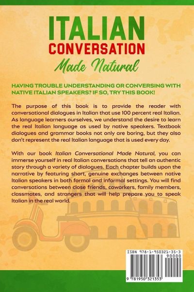 Having trouble understanding or conversing with native Italian speakers? If so, try this book! The purpose of this book is to provide the reader with conversational dialogues in Italian that use 100 percent real Italian. As language learners ourselves, we understand the desire to learn the real Italian language as used by native speakers. Textbook dialogues and grammar books not only are boring, but they also don't represent the real Italian language that is used every day. With our book Italian Conversational Made Natural, you can immerse yourself in real Italian conversations that tell an authentic story through a variety of dialogues. Each chapter builds upon the narrative by featuring short, genuine exchanges between native Italian speakers in both formal and informal settings. You will find conversations between close friends, coworkers, family members, classmates, and strangers that will help prepare you to speak Italian in the real world. Along the way, you'll also find several situational scenarios from daily life to improve your Italian language ability. These include picking up prescriptions at the pharmacy, checking out books from the library, and ordering food at a restaurant. Each dialogue has been written and edited by native Italian speakers from Italy, so you can be absolutely sure that you are getting the most natural Italian grammar, vocabulary, and phrases. Each chapter also comes with comprehension questions to test your understanding of the story and the Italian used. No drills or grammatical exercises are necessary to learn Italian! Our language learning method focuses on the power of extensive reading and listening to achieve fluency. You will find more information about this in the book's introduction. (The level of the material is best suited for intermediate learners or beginners who are looking for a challenge.) Grab your copy now and get started today!