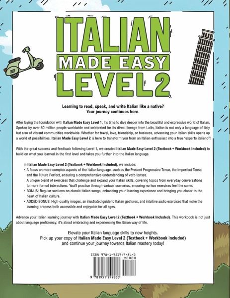 Learning to read, speak, and write Italian like a native? Your journey continues here. After laying the foundation with Italian Made Easy Level 1, it's time to dive deeper into the beautiful and expressive world of Italian. Spoken by over 80 million people worldwide and celebrated for its direct lineage from Latin, Italian is not only a language of Italy but also of vibrant communities worldwide. Whether for travel, love, friendship, or business, advancing your Italian skills opens up a world of possibilities. Italian Made Easy Level 2 is here to transform you from an Italian enthusiast into a true "esperto italiano"!In this book we include:A focus on more complex aspects of the Italian language, such as the Present Progressive Tense, the Imperfect Tense, and the Future Perfect, ensuring a comprehensive understanding of verb tenses. A unique blend of exercises that challenge and expand your Italian skills, covering topics from everyday conversations to more formal interactions. You'll practice through various scenarios, ensuring no two exercises feel the same. BONUS: Regular sections on classic Italian songs, enhancing your learning experience and bringing you closer to the heart of Italian culture. ADDED BONUS: High-quality images, an illustrated guide to Italian gestures, and intuitive audio exercises that make the learning process both accessible and enjoyable for all ages. This workbook is not just about language proficiency; it's about embracing and experiencing the Italian way of life. Pick up your copy of Italian Made Easy Level 2 and continue your journey towards Italian mastery today!