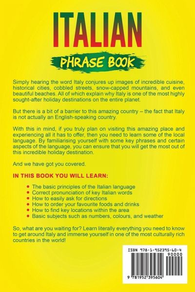 Simply hearing the word Italy conjures up images of incredible cuisine, historical cities, cobbled streets, snow-capped mountains, and even beautiful beaches. All of which explain why Italy is one of the most highly sought-after holiday destinations on the entire planet. But there is a bit of a barrier to this amazing country – the fact that Italy is not actually an English-speaking country. With this in mind, if you truly plan on visiting this amazing place and experiencing all it has to offer, then you need to learn some of the local language. By familiarizing yourself with some key phrases and certain aspects of the language, you can ensure that you will get the most out of this incredible holiday destination. And we have got you covered. In this book you will learn: The basic principles of the Italian language Correct pronunciation of key Italian words How to easily ask for directions How to order your favorite foods and drinks How to find key locations within the area Basic subjects such as numbers, colors, and weather So, what are you waiting for? Learn literally everything you need to know to get around Italy and immerse yourself in one of the most culturally rich countries in the world!