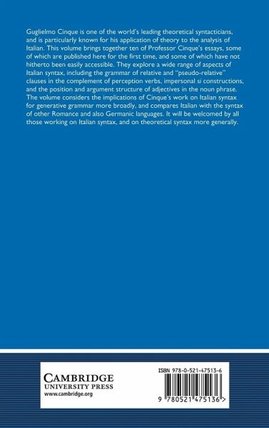 Guglielmo Cinque is one of the world's leading theoretical syntacticians, and is particularly known for his application of recent theory to the analysis of Italian. This volume brings together ten of Professor Cinque's essays, some of which are published here for the first time, and some of which have not hitherto been easily available. They explore a wide range of aspects of Italian syntax, including the grammar of relative and 'pseudo-relative' clauses in the complement of perception verbs, impersonal si constructions, and the position and argument structure of adjectives in the noun phrase. The volume considers the implications of Cinque's work on Italian syntax for generative grammar more broadly, and compares Italian with the syntax of other Romance and also Germanic languages. It will be welcomed by all those working on Italian syntax, and on theoretical syntax generally.