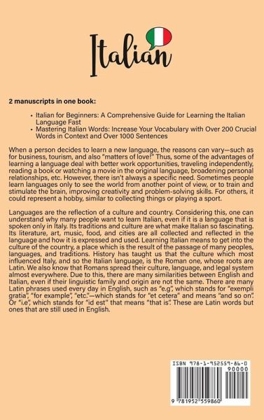 If you want to learn the Italian language fast, then keep reading... Two manuscripts in one book:Italian for Beginners: A Comprehensive Guide for Learning the Italian Language Fast Mastering Italian Words: Increase Your Vocabulary with Over 200 Crucial Words in Context and Over 1000 Sentences Wanting to learn the Italian language, but don't know how - or where - to start? If so, you've come to the right place. The purpose of this book is to show you that you can learn a language, no matter how hard it might seem in the beginning. This book will give you all the necessary tools to understand how to create a sentence and orient yourself in the depth of exceptions which characterized Italian as a Latin language. You will find dialogues with a step-by-step translation and some questions with answer keys. This book will give you an excellent introduction to the Italian language, and by starting with the very basics, the book will increase your knowledge step-by-step. The exercises provide you with a lot of practice; many useful words and phrases are included for reference during your learning, and for a long time after. Many real-life conversations and situations included in this book make it your perfect companion on your learning journey. Here's just a fraction of what you'll learn in part 1 of this book:The basics, such as the rules for spelling and sounds, numbers, and days of the week. Many useful verbs, and examples of how they are used in sentences. The grammar rules that apply to nouns and verbs. Basic Italian phrases to be used in conversations. Useful phrases when traveling, at the hotel, in restaurants, or shops. Many, many different words for daily use. And much more! For those who already have some concept of Italian, part 2 of this book offers you a wide range of words to refresh your grammar rules and help you learn the meaning of different words and how they change depending on the context. Memorizing words via this book's process is a simple way to learn Italian fast, enjoying your learning process much more than you would if you used the classic methods. Step by step, sentence by sentence, word by word, you will find yourself more and more comfortable with the language. This is the dynamic immersion method, which is based on how kids learn their mother tongue. Each word and sentence is translated step by step, and with so many Italian words in context, you can't go wrong if you're looking to learn Italian. So if you want to learn Italian fast, then scroll up and click the "add to cart" button!