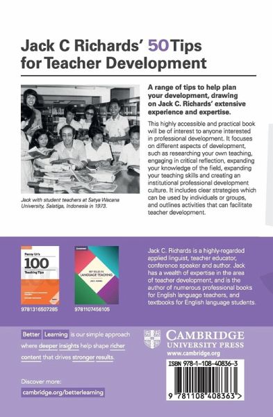 This book offers 50 practical ideas for teachers to use for their professional development. The tips cover a wide range of activities that can be carried out individually or in collaboration with others, including self and peer observation, journal writing, on-line forums, classroom research, action research, team teaching, lesson review, materials review, lesson study, mentoring, peer coaching, reading groups, and workshops. The Tips can be used by both novice and more experienced teachers and are intended to provide a basis for teachers to review the current state of their professional learning and to develop and implement goals for their development.