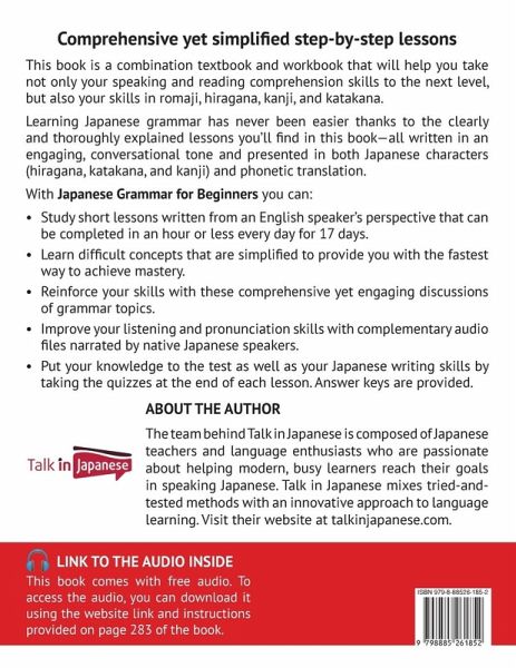 Learn Japanese grammar with ease, even if you are an absolute beginner. This book is designed to address the key areas where students frequently struggle. It provides a step-by-step learning method that anyone can follow and will take your Japanese to new heights! Inside "Japanese Grammar for Beginners" you'll find:17 beginner-level Japanese grammar topics: This combination of textbook and workbook will give you a good foundation to achieve mastery and fluency. Straight-to-the-point lessons: No extra fluff and frills. With concise yet entertaining explanations, difficult grammatical topics are broken down and simplified in a conversational tone. An integrated workbook with exercises: Challenge yourself and reinforce your comprehension as well as your writing skills in hiragana, katakana, and kanji by doing the exercises after each lesson. Audio for pronunciation and listening practice: Improve your listening and speaking skills in Japanese by listening to the audio narrated by native Japanese speakers. Grab your copy of this book today and start learning Japanese grammar the non-boring way!