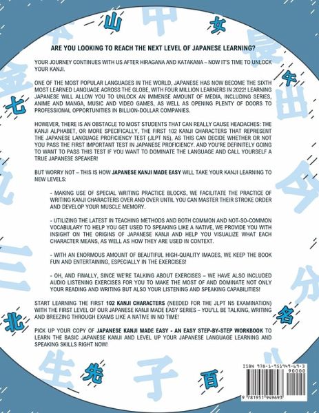 Are you looking to reach the next level in Japanese? It's time to learn Kanji, the easy way. One of the most popular languages in the world, Japanese has now become the sixth most learned language across the globe, with over four million learners! Learning Japanese will allow you to unlock an immense amount of media, including series, anime and manga, music and video games, as well as opening plenty of doors to professional opportunities in billion-dollar companies. However, there is an obstacle to most students that can really cause headaches: the Kanji alphabet, or more specifically, the first 102 Kanji characters that represent the Japanese Language Proficiency Test (JLPT N5), as this can decide whether or not you pass the first important test in Japanese proficiency. And you're definitely going to want to pass this test if you want to dominate the language and call yourself a true Japanese speaker! But worry not - this is how Japanese Kanji Made Easy will take your Kanji learning to new levels:· Making use of special writing practice blocks, we facilitate the practice of writing Kanji characters with our step-by-step approach until you master their stroke order and develop your muscle memory.· Utilizing the latest in teaching methods and both common and not-so-common vocabulary to help you get used to speaking like a native, we provide you with insight into the origins of Japanese Kanji and help you visualize what each character means, as well as how they are used in context.· With an enormous amount of beautiful high-quality images, we keep the book fun and entertaining, especially in the exercises!· Oh, and finally, since we're talking about exercises - we have also included audio listening exercises for you to make the most of and dominate not only your reading and writing but also your listening and speaking capabilities! Start learning the first 102 Kanji characters (needed for the JLPT N5 examination) with the first level of our Japanese Kanji Made Easy series - you'll be talking, writing and breezing through exams like a native in no time! Pick up your copy of Japanese Kanji Made Easy and level up your Japanese language learning and speaking skills right now!