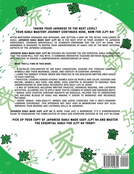 Taking your Japanese to the next level? Your Kanji mastery journey continues here, now for JLPT N4! After mastering Hiragana and Katakana, and getting a grip on the initial challenges of Kanji, Japanese Kanji Made Easy JLPT N4 is the next step in your journey to Japanese proficiency. Catering specifically to students preparing for the JLPT N4 exam, this workbook is designed to deepen your understanding of Kanji, one of the most integral aspects of the Japanese language. Japanese Kanji Made Easy JLPT N4 focuses on teaching the 200 essential Kanji characters that the exam will test you with. It combines innovative teaching methods with practical applications to ensure a comprehensive understanding of Kanji. What you'll find in this book: · A detailed exploration of 200 Kanji characters, guiding you through complex symbols and their meanings, usage, and context in everyday Japanese.· Learn the correct stroke order and practice in the dedicated writing area added to each chapter.· Practical lessons across diverse themes such as People and Color, Seasons and Nature, Animals and Food, and more. Each chapter is designed to enhance your understanding of how Kanji integrates into daily life in Japan.· A mix of exercises including writing practice, advanced reading, and listening activities, allowing you to apply what you've learned in varied and engaging ways.· BONUS: Each chapter contains insights on radicals, helping you to understand the building blocks of Kanji and making it easier to memorize and recognize patterns.· ADDED BONUS: High-quality images and audio exercises for a multi-sensory learning experience. This approach not only aids in memorizing Kanji but also improves your reading and listening skills in Japanese. Japanese Kanji Made Easy JLPT N4 is more than just a workbook; it's a comprehensive guide to conquering the complexities of Kanji and achieving success in the JLPT N4 exam. Pick up your copy of Japanese Kanji Made Easy JLPT N4 and master the essential Kanji for JLPT N4 today!