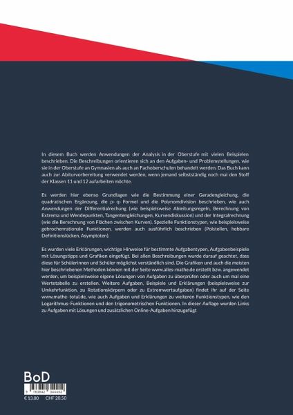 In diesem Buch werden Anwendungen der Analysis in der Oberstufe mit vielen Beispielen beschrieben. Die Beschreibungen orientieren sich an den Aufgaben- und Problemstellungen, wie sie in der Oberstufe an Gymnasien als auch an Fachoberschulen behandelt werden. Das Buch kann man auch zur Abiturvorbereitung verwenden, wenn man selbstständig noch mal den Stoff aus der Oberstufe aufarbeiten möchte. Es werden hier ebenso Grundlagen, wie die Bestimmung einer Geradengleichung, die quadratische Ergänzung, die p-q-Formel und die Polynomdivision beschrieben, wie auch Anwendungen der Differentialrechung (Ableitungsregeln, Extrema, Wendepunkte, Tangentengleichungen, Kurvendiskussion, ...) und der Integralrechnung (Flächen zwischen Kurven, partielle Integration, ...). Einige Funktionstypen, wie beispielsweise gebrochenrationale Funktionen, werden auch ausführlich beschrieben (Polstellen, hebbare Definitionslücken, Asymptoten). Es wurden viele Erklärungen, wichtige Hinweise für bestimmte Aufgabentypen, Aufgabenbeispiele mit Lösungstipps und Grafiken eingefügt. Bei allen Beschreibungen wurde darauf geachtet, dass diese für Schülerinnen und Schüler möglichst verständlich sind. Die Grafiken und auch die meisten hier beschriebenen Methoden können mit der Seite www.alles-Mathe.de erstellt bzw. angewendet werden, um beispielsweise eigene Lösungen von Aufgaben zu überprüfen oder auch mal um eine Wertetabelle zu erstellen. Weitere Aufgaben und Beispiele zum Buch sind auf der Seite www.Mathe-total.de zu finden.
