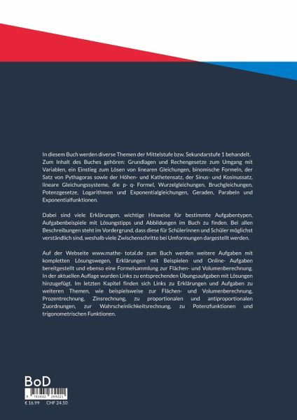 In diesem Buch werden diverse Themen der Mittelstufe bzw. Sekundarstufe 1 behandelt. Zum Inhalt des Buches gehören: Grundlagen und Rechengesetze zum Umgang mit Variablen, ein Einstieg zum Lösen von linearen Gleichungen, die binomische Formeln, der Satz von Pythagoras sowie der Höhen- und Kathetensatz, der Sinus- und Kosinussatz, Gleichungssysteme, die p-q-Formel, Wurzelgleichungen, Bruchgleichungen, Potenzgesetze, Logarithmen und Exponentialgleichungen, Geraden, Parabeln und Exponentialfunktionen. Dabei sind viele Erklärungen, wichtige Hinweise für bestimmte Aufgabentypen, Aufgabenbeispiele mit Lösungstipps und Grafiken im Buch zu finden. Bei allen Beschreibungen steht im Vordergrund, dass diese für Schülerinnen und Schüler möglichst verständlich sind, weshalb auch viele Zwischenschritte bei Umformungen dargestellt werden. Auf den beiden Seiten zum Buch, der Seite www.alles-Mathe.de und der Seite www.Mathe-total.de werden Programme zum Lösen von Aufgaben und zum Erstellen von Graphen bereitgestellt wie auch Übungsaufgaben, Ergänzungen zum Buch und eine Formelsammlung zur Flächen- und Volumenberechnung.