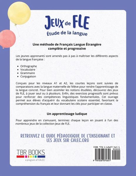 Une méthode de Français Langue Étrangère complète et progressive Les jeunes apprenants sont amenés pas à pas à maîtriser les différents aspects de la langue française : Orthographe Vocabulaire Grammaire Conjugaison Conçues pour les niveaux A1 et A2, les courtes leçons sont suivies de comparaisons avec la langue maternelle de l'élève pour rendre l'apprentissage de la langue concret. Des exercices progressifs sont prévus pour renforcer des compétences linguistiques fondamentales. Enfin, pour bien assimiler les notions étudiées, découvrez des jeux de FLE, à jouer seul ou à plusieurs. Cet ouvrage permet aux élèves d'acquérir du vocabulaire scolaire essentiel, favorisant la compréhension du français et leur donnant les clés pour participer en classe. Un apprentissage ludique Pour apprendre en s'amusant, terminez chaque leçon en jouant à l'un des nombreux jeux de la collection Jeux de FLE à retrouver sur calec.org.