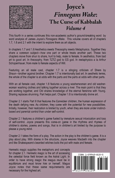 This fourth in a series continues this non-academic author's ground-breaking word by word analysis of James Joyce's Finnegans Wake. This volume covers all of chapters 1.7, 1.8 and 2.1 with the intent to explore them as art objects. In chapters 1.7 and 1.8 Aesthetics meets Theosophy meets Metaphysics. Together they share a common subject-how one part or whole treats another part. These two chapters move from shun to share, hurt to help, male to female. In aesthetics, from bad art to good art. In theosophy, from TZTZ god to ES god. In metaphysics a la Arthur Schopenhauer, from male to female aspects of Will. Featuring an all male cast, chapter 1.7 is a stinging criticism of Shem by Shaun-brother against brother. Chapter 1.7 is intentionally bad art. In aesthetic terms, the whole of the chapter is at odds with the parts and the parts at odds with other parts. With an all female cast, chapter 1.8 features a young washerwoman and old washerwoman washing clothes and talking together across a river. The main point is that they are working together, and Old shares knowledge of the eternal feminine with Young. Sharing replaces shunning. Part helps part. Chapter 1.8 is intentionally divine art. Chapter 2.1 starts Part II that features the Earwicker children, the human expression of the death defying new. As children, they come with the potential for new possibilities. Initially, however, their realization is limited by youth, when they are more under instinct-based and parental control than under self-control. Chapter 2.1 features a children's game fueled by immature sexual intoxication and loss of self-control. Joyce presents this come-on game in the rhythms and rhymes of children's stories, poems and songs, that is in children's art limited by the purpose to please a young mind. Chapter 2.1 takes the form of a play. The action in the play is the children's game. It is a play about play. With drama in the structure, Joyce weaves Macbeth into the chapter and like Shakespeare's bearded witches, boils the pot with male and female. Hermetic magic supplies the metaphors and concepts for chapter 2.1. Hermetic magic is the art of accessing the celestial force field known as the Astral Light. In order to have strong magic the magus must be in equilibrium and must know him or herself. Magus Joyce notes that these same requirements are necessary for the highest art.