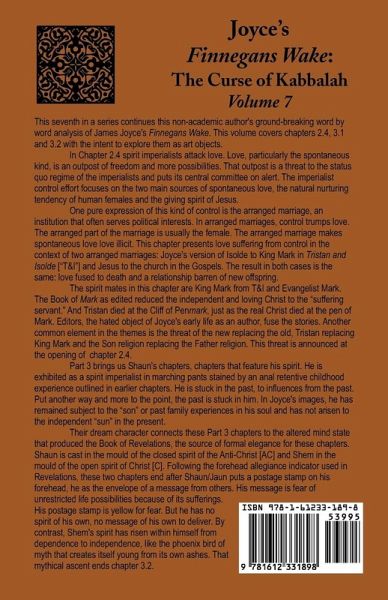 This seventh in a series continues this non-academic author's ground-breaking word-by-word analysis of James Joyce's Finnegans Wake. This volume covers chapters 2.4, 3.1 and 3.2 with the intent to explore them as art objects. In Chapter 2.4 spirit imperialists attack love. Love, particularly the spontaneous kind, is an outpost of freedom and more possibilities. That outpost is a threat to the status quo regime of the imperialists and puts its central committee on alert. The imperialist control effort focuses on the two main sources of spontaneous love, the natural nurturing tendency of human females and the giving spirit of Jesus. One pure expression of this kind of control is the arranged marriage, an institution that often serves political interests. In arranged marriages, control trumps love. The arranged part of the marriage is usually the female. The arranged marriage makes spontaneous love illicit. This chapter presents love suffering from control in the context of two arranged marriages: Joyce's version of Isolde to King Mark in Tristan and Isolde ["T&I"] and Jesus to the church in the Gospels. The result in both cases is the same: love fused to death and a relationship barren of new offspring. The spirit mates in this chapter are King Mark from T&I and Evangelist Mark. The Book of Mark as edited reduced the independent and loving Christ to the "suffering servant," and Tristan died at the Cliff of Penmark, just as the real Christ died at the pen of Mark. Editors, the hated object of Joyce's early life as an author, fuse the stories. Another common element in the themes is the threat of the new replacing the old: Tristan replacing King Mark and the Son religion replacing the Father religion. This threat is announced at the opening of chapter 2.4. Part 3 brings us Shaun's chapters, chapters that feature his spirit. He is exhibited as a spirit imperialist in marching pants stained by an anal retentive childhood experience outlined in earlier chapters. He is stuck in the past, to influences from the past. Put another way and more to the point, the past is stuck in him. In Joyce's images, he has remained subject to the "son" or past family experiences in his soul and has not arisen to the independent "sun" in the present. Their dream character connects these Part 3 chapters to the altered mind state that produced the Book of Revelations, the source of formal elegance for these chapters. Shaun is cast in the mould of the closed spirit of the Anti-Christ [AC] and Shem in the mould of the open spirit of Christ [C]. Following the forehead allegiance indicator used in Revelations, these two chapters end after Shaun/Jaun puts a postage stamp on his forehead, he as the envelope of a message from others. His message is fear of unrestricted life possibilities because of its sufferings. His postage stamp is yellow for fear, but he has no spirit of his own, no message of his own to deliver. By contrast, Shem's spirit has risen within himself from dependence to independence, like the phoenix bird of myth that creates itself young from its own ashes. That mythical ascent ends chapter 3.2.