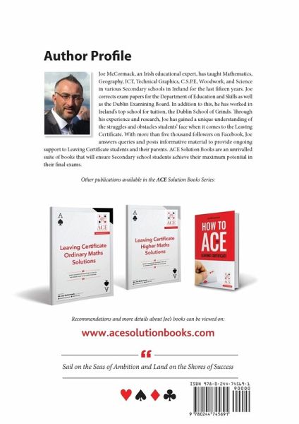 These books contain clear and comprehensive solutions to the Junior Certificate Higher Exam Paper Questions for the last four years (2018, 2017, 2016 and 2015). The 2014, 2013 and 2012 solutions are also available to download and view on any device and can be added to your cart at checkout later if you wish. The unique handwritten solutions are easy to understand for the weaker student but will also provide the high flyer with the skills to hit the "H1" grade. There is one hundred and fifty eight pages of the best notes in each book making it a competitive production at this price point. Each book contains the most detailed solutions of any Maths book on the market in Ireland and sets out every single line of the solution (step by step) with notes explaining the Maths behind them. The solutions encompass all topics on the course including Algebra, Geometry, Probability, Statistics, Trigonometry, Area and Volume, Enlargements, etc.. They also give an insight into the marking scheme of each paper. Students who regularly use these books negate the need to spend hundreds of Euro’s on tuition, as many parents have commented to me over the years. Students can easily follow the stepped solutions on their own and subsequently learn how to apply it to a similar styled exam question later. The most efficient way for a student to use the book is to try each question part for themselves first and then subsequently refer to my solution to see where they have gone right or wrong; hence the student is always ‘learning by doing’. If you need more Information on the content and usefulness of these books, feel free to e-mail me at: acesolutionbooks@gmail.com Note: There are three other books available in this series: ACE Leaving Certificate Higher Level Maths Solutions ACE Leaving Certificate Ordinary Level Maths Solutions How to ACE the Leaving Certificate (All Subjects)