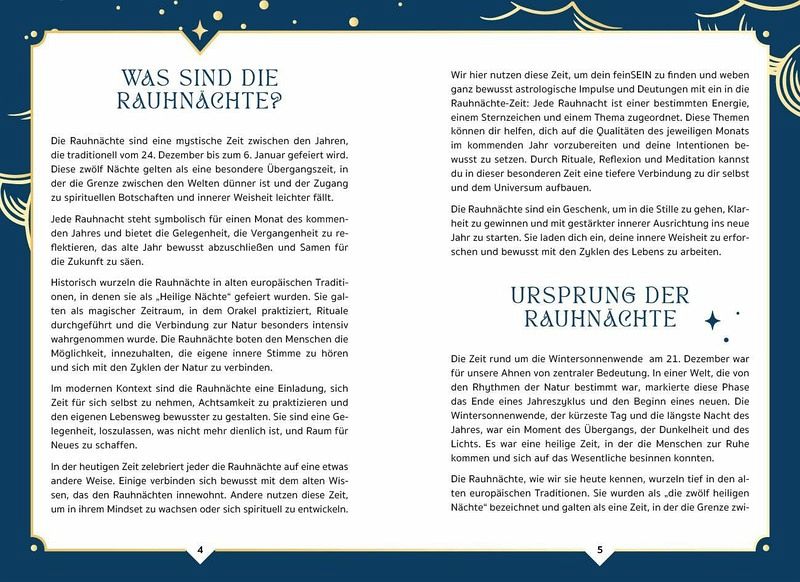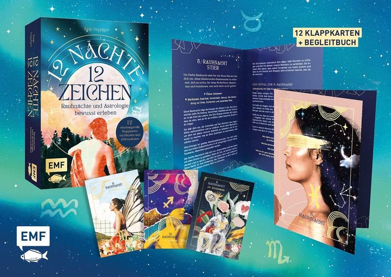 Die Rauhnächte rund um den Jahreswechsel sind die perfekte Zeit, um nach dem trubeligen Advent zur Ruhe zu kommen, das vergangene Jahr zu reflektieren und Kraft für das kommende Jahr zu tanken. Mit dem wunderschönen Klappkarten-Set von Rauhnächte-Expertin Tanja Suppiger hältst du den idealen Begleiter für diese Zeit des Innehaltens in deinen Händen. Die einzigartige Kombination aus Sternzeichen und Rauhnächten, macht es dir noch leichter, die besondere Energiequalität, die jeder einzelnen Rauhnacht innewohnt, ganz nah und greifbar zu erleben: Nutze die Widder-Energie in der vierten Rauhnacht, um deine Willenskraft fürs neue Jahr auszurichten, und verbinde dich mit der intuitiven Kraft des Sternzeichens Krebs, um deine Beziehungen zu reflektieren und aufs nächste Level zu bringen.