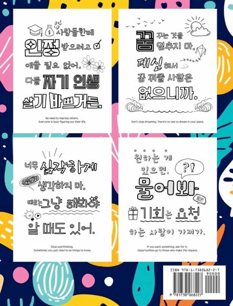 Embark on an enriching journey with the Motivational Korean Writing & Coloring Book, a unique combination of Korean writing practice and motivational quotes, tailored for adults at a beginner level. This workbook offers more than just a Korean study for beginners, it integrates art and wisdom to make learning Korean an enriching experience. Here's what you'll discover in this Hangul practice & coloring workbook: Inspirational Quotes: Engage in Korean Hangul writing practice with motivational quotes that not only inspire positivity and resilience but also provide wisdom to apply to your daily life. Dual Language Practice: Each quote in this book, is written in Korean, but completed with an English translation to help improve your understanding and comprehension of the Korean language. Art and Language Combined: As a unique Korean coloring book, it stimulates your creativity while helping you internalize the quotes and their meanings, turning language learning into a therapeutic activity. For Beginner and Intermediate Levels: This Korean workbook for adult beginners and intermediate learners caters to all levels. No prior knowledge is necessary to enjoy and learn from this book. Learning Reinforced by Art: By coloring the quotes you're practicing to write, you engage different parts of your brain, facilitating better memorization and understanding of Korean phrases and expressions. Ideal Gift: Perfect for language learners, motivational quote lovers, or anyone looking for a creative yet educational pastime. It's a unique gift that brings together personal growth, relaxation, and language learning in a simple, beginner-friendly format. Begin your enriching journey with the "Keep Going: Motivational Korean Writing & Coloring Book" today, and experience the joy of learning the Korean language through the inspirational lens of motivational quotes. ¿¿¿¿¿¿¿Are you ready for this transformative journey? Grab a copy today!