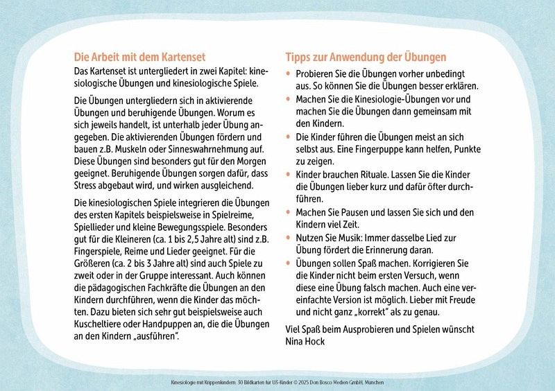Aktivierung oder Entspannung: Je nach den Bedürfnissen Ihrer Schützlinge können Sie aus den Bildkarten die Übung auswählen, die gerade passt. Die spielerische Herangehensweise sorgt dafür, dass Krippenkinder nicht überfordert sind und von der ganzheitlichen Methode der Kinesiologie profitieren.