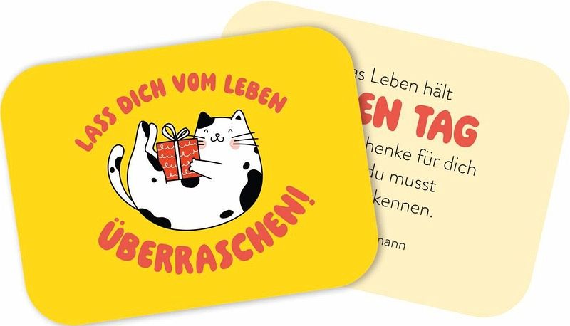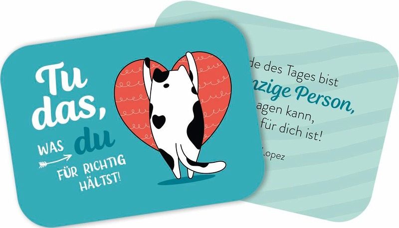 Jede der 25 hübsch gestalteten Kärtchen enthält einen Wunsch, ein Zitat oder ein Kompliment. Die Katzen-Karten können auch einzeln verteilt werden oder einem Geschenk oder einem Brief beigelegt werden. Die lieben Botschaften erinnern die Beschenkten daran, dass sie etwas Besonderes sind. Für ein kleines bisschen mehr Liebe in der Welt.