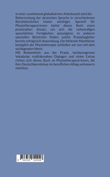 In einer zunehmend globalisierten Arbeitswelt wird die Beherrschung der deutschen Sprache in verschiedenen Berufsbereichen immer wichtiger. Speziell für Physiotherapeut:innen bietet dieses Buch einen praxisnahen Ansatz, um sich die notwendigen sprachlichen Fertigkeiten anzueignen. In anderen speziellen Bereichen finden solche Praxisbegleiter bereits erfolgreich Anwendung. Die fehlende Marktlücke bezüglich der Physiotherapie schließen wir nun mit dem vorliegenden Werk. Mit Redemitteln aus der Praxis, fachbezogenem Vokabular, realitätsnahen Dialogen und vielen Extras richtet sich dieses Buch an Physiotherapeut:innen, die ihre Deutschkenntnisse im beruflichen Alltag verbessern möchten.