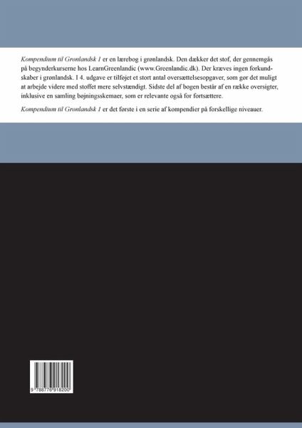 Kompendium til Grønlandsk 1 dækker det stof, der gennemgås på LearnGreenlandic's begynderkurser, og kræver ingen sproglige forudsætninger. Materialet er udarbejdet til undervisningsbrug og er ikke tænkt som oplæg til selvstudier. Den sidste del af bogen består af en række oversigter, inklusive en samling bøjningsskemaer, som er relevante også for fortsættere.