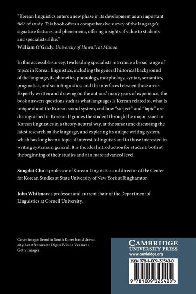 In this accessible survey, two leading specialists introduce a broad range of topics in Korean linguistics, including the general historical background of the language, its phonetics, phonology, morphology, syntax, semantics, pragmatics, and sociolinguistics, and the interfaces between those areas. Expertly written and drawing on the authors' many years of experience, the book answers questions such as what languages is Korean related to, what is unique about the Korean sound system, and how are 'subject' and 'topic' distinguished in Korean. It guides the student through the major issues in Korean linguistics in a theory-neutral way, at the same time discussing the latest research on the language, and exploring its unique writing system, which has long been a topic of interest to linguists and to those interested in writing systems in general. It is the ideal introduction for students both at the beginning of their studies, and at a more advanced level.
