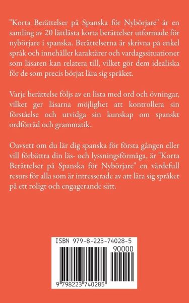 "Korta Berättelser på Spanska för Nybörjare" är en samling av 20 lättlästa korta berättelser utformade för nybörjare i spanska. Berättelserna är skrivna på enkel språk och innehåller karaktärer och vardagssituationer som läsaren kan relatera till, vilket gör dem idealiska för de som precis börjat lära sig språket. Varje berättelse följs av en lista med ord och övningar, vilket ger läsarna möjlighet att kontrollera sin förståelse och utvidga sin kunskap om spanskt ordförråd och grammatik. Oavsett om du lär dig spanska för första gången eller vill förbättra din läs- och lyssningsförmåga, är "Korta Berättelser på Spanska för Nybörjare" en värdefull resurs för alla som är intresserade av att lära sig språket på ett roligt och engagerande sätt.