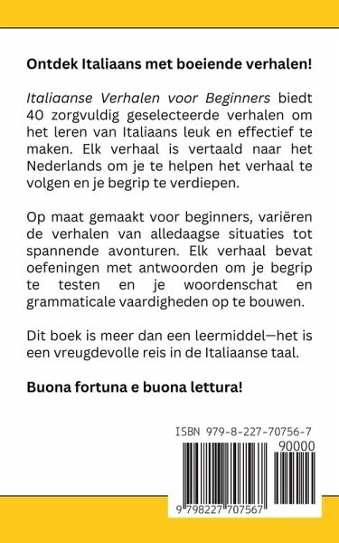 Welkom in het boek "Korte Verhalen in Italiaans voor Beginners". Deze unieke collectie bevat 40 verhalen die zorgvuldig zijn geselecteerd om je te helpen de Italiaanse taal te leren. Elk verhaal is vertaald naar het Nederlands, wat het begrijpen en volgen van de verhalen vergemakkelijkt. Bovendien vind je na elk verhaal oefeningen met antwoorden die je helpen de opgedane kennis te consolideren. De verhalen in dit boek zijn thematisch en qua moeilijkheidsgraad gevarieerd, maar allemaal afgestemd op het niveau van beginners. Je vindt hier dagelijkse verhalen en ook meer spannende avonturen. Elk verhaal is bedoeld om je kennis van de Italiaanse taal op een leuke en boeiende manier te ontwikkelen. De oefeningen die bij elk verhaal horen, zijn ontworpen om je begrip van de tekst te testen en je te helpen nieuwe woorden en grammaticale structuren te leren. Dankzij deze oefeningen kun je systematisch je taalvaardigheden ontwikkelen. Ik hoop dat dit boek niet alleen een leermiddel voor je wordt, maar ook een bron van plezier en voldoening bij het ontdekken van een nieuwe taal. Buona fortuna e buona lettura!