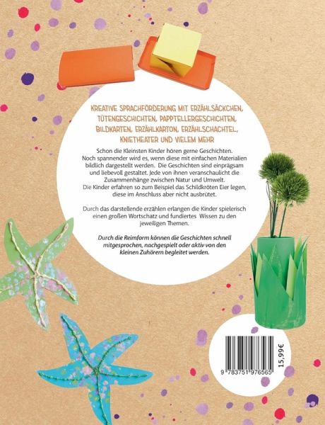 Schon die Kleinsten Kinder hören gerne Geschichten. Noch spannender wird es, wenn diese mit einfachen Materialien bildlich dargestellt werden. Die Geschichten sind in Reimform geschrieben,jede von ihnen veranschaulicht die Zusammenhänge zwischen Natur und Umwelt. Die Kinder erfahren zum Beispiel, dass Schildkröten Eier legen, diese im Anschluss aber nicht ausbrüten. Durch das darstellende erzählen erlangen die Kinder spielerisch einen großen Wortschatz und fundiertes Wissen zu den jeweiligen Themen. Das Buch enthält 47 kleine Geschichten und ein paar gebastelte Beispiele aus der Praxis. Werden sie kreativ, gestalten sie Erzählsäckchen, Schachtelgeschichte, Erzähldosen, Tellergeschichten und vieles mehr.