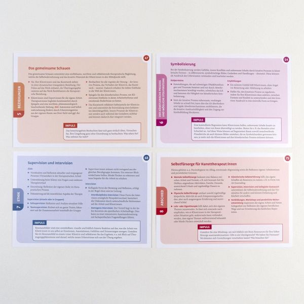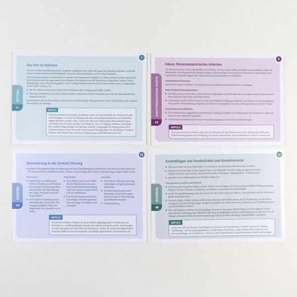 Gemeinsam mit Patient:innen kreativ werden-Leicht umsetzbare Anleitungen-Einsetzbar in verschiedensten Settings»Ein Bild sagt mehr als 1000 Worte« - dieses Sprichwort trifft auf kunsttherapeutisches Arbeiten ganz besonders zu. Mit vielfältigen Werkstoffen, Schere, Farbe, Pinsel und Leinwand gemeinsam mit Patient:innen kreativ zu arbeiten kann sichtbar machen, was nicht in Worte zu fassen ist, und den therapeutischen Prozess voranbringen. Das Kartenset stellt kompakt und übersichtlich die kunsttherapeutische Praxis dar. Es bietet einen reichen Fundus für angehende wie auch erfahrene Kunsttherapeut:innen sowie für Psychotherapeut:innen, Berater:innen und Coaches, die ihre Arbeit mit Wissen und Methoden aus der Kunsttherapie bereichern möchten.Aus dem InhaltSetting - Kunsttherapeutische Ansätze - Einstieg - Material - Beziehungen - Der Künstlerische Prozess und mögliche Stolpersteine - Ethik - Abschied