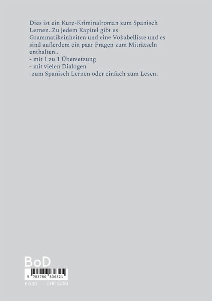 Dies ist ein Kurz-Kriminalroman zum Spanisch Lernen..Zu jedem Kapitel gibt es Grammatikeinheiten und eine Vokabelliste und es sind außerdem ein paar Fragen zum Miträtseln enthalten..- mit 1 zu 1 Übersetzung- mit vielen Dialogen-zum Spanisch Lernen oder einfach zum Lesen.