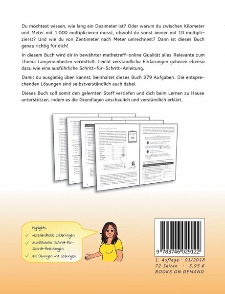 Du möchtest wissen, wie lang ein Dezimeter ist? Oder warum du zwischen Kilometer und Meter mit 1.000 multiplizieren musst, obwohl du sonst immer mit 10 multiplizierst? Und wie du von Zentimeter nach Meter umrechnest? Dann ist dieses Buch genau richtig für dich! In diesem Buch wird dir in bewährter mathetreff-online Qualität alles Relevante zum Thema Längeneinheiten vermittelt. Leicht verständliche Erklärungen gehören ebenso dazu wie eine ausführliche Schritt-für-Schritt-Anleitung. Damit du ausgiebig üben kannst, beinhaltet dieses Buch 379 Aufgaben. Die entsprechenden Lösungen sind selbstverständlich auch dabei. Dieses Buch soll somit den gelernten Stoff vertiefen und dich beim Lernen zu Hause unterstützen, indem es die Grundlagen anschaulich und verständlich erklärt. Highlights:- verständliche Erklärungen - ausführliche Schritt-für-Schritt-Anleitungen - 379 Übungen mit Lösungen