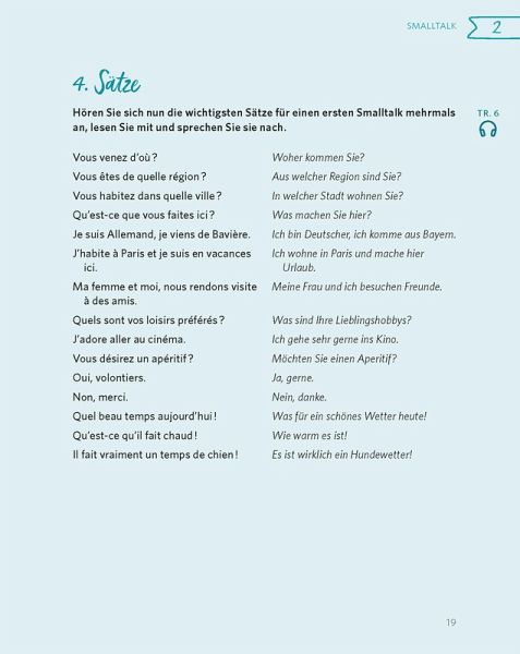 Hören und lernen Sie den Wortschatz und erste Sätze zu 12 verschiedenen Themen aus Alltag und UrlaubIn abwechslungsreichen Übungen prägt sich der Wortschatz nachhaltig einWenden Sie das Gelernte an, indem Sie erste kleine Dialoge anhören und die Rolle einesGesprächspartners übernehmenSo lernen Sie in ganz alltäglichen Situationen auf Französisch mitzureden.Alle Wörter, Sätze und Dialoge finden Sie als Audios in der Scan2Learn-AppNiveau A1: Für den Einstieg