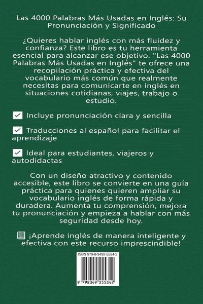 ¿Quieres hablar inglés con más fluidez y confianza? Este libro es tu herramienta esencial para alcanzar ese objetivo. "Las 4000 Palabras Más Usadas en Inglés" te ofrece una recopilación práctica y efectiva del vocabulario más común que realmente necesitas para comunicarte en inglés en situaciones cotidianas, viajes, trabajo o estudio. ¿ Incluye pronunciación clara y sencilla ¿ Traducciones al español para facilitar el aprendizaje ¿ Ideal para estudiantes, viajeros y autodidactas Con un diseño atractivo y contenido accesible, este libro se convierte en una guía práctica para quienes quieren ampliar su vocabulario inglés de forma rápida y duradera. Aumenta tu comprensión, mejora tu pronunciación y empieza a hablar con más seguridad desde hoy. ¿¿¿¿ ¡Aprende inglés de manera inteligente y efectiva con este recurso imprescindible!