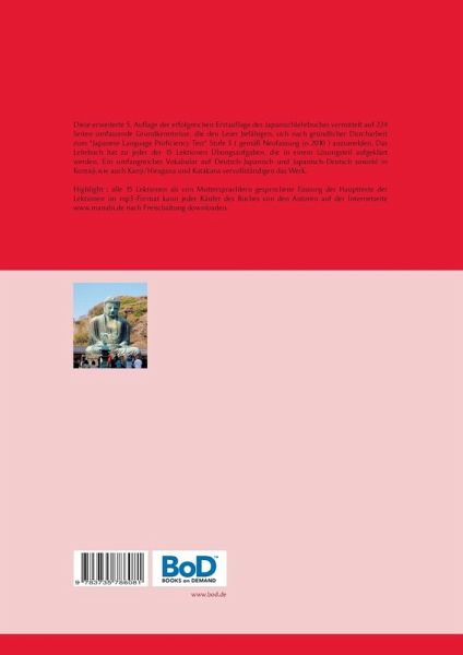 Diese erweiterte 6. Auflage der erfolgreichen Erstauflage des Japanischlehrbuches vermittelt auf 224 Seiten umfassende Grundkenntnisse, die den Leser befähigen, sich nach gründlicher Durcharbeit zum "Japanese Language Proficiency Test" Stufe 5 anzumelden. Das Lehrbuch hat zu jeder der 15 Lektionen Übungsaufgaben, die in einem Lösungsteil aufgeklärt werden. Ein umfangreiches Vokabular auf Deutsch-Japanisch und Japanisch-Deutsch sowohl in Romaji,wie auch Kanji/Hiragana und Katakana vervollständigen das Werk. Illustriert wurde das Lehrbuch neu von der japanischen Kunststudentin Frau Marika Ajima. Highlight : alle 15 Lektionen als von Muttersprachlern gesprochene Fassung der Haupttexte der Lektionen im PowerPoint Format kann jeder Käufer des Buches von den Autoren bekommen, wenn der Kauf über www.sprachschule-manabi.de verifiziert wird.