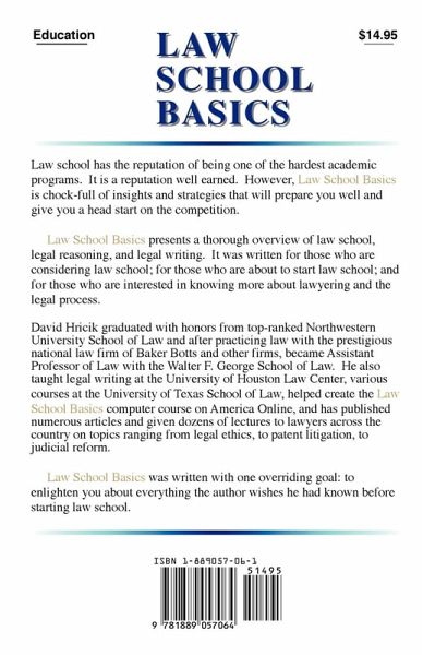 Law school has the reputation of being one of the hardest academic programs. It is a reputation well earned. However, Law School Basics is chock-full of insights and strategies that will prepare you well and give you a head start on the competition. Law School Basics presents a thorough overview of law school, legal reasoning, and legal writing. It was written for those who are considering law school; for those who are about to start law school; and for those who are interested in knowing more about lawyering and the legal process. Law School Basics was written with one overriding goal: to enlighten you about everything the author wishes he had known before starting law school.