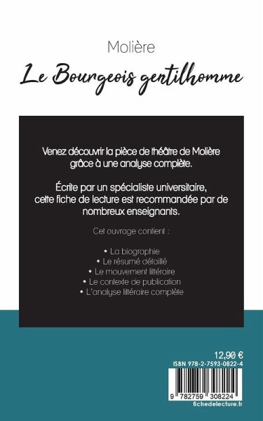 Venez découvrir Le Bourgeois gentilhomme de Molière grâce à une analyse littéraire de référence ! Écrite par un spécialiste universitaire, cette fiche de lecture est recommandée par de nombreux enseignants. Cet ouvrage contient la biographie de l'écrivain, le résumé détaillé, le mouvement littéraire, le contexte de publication de l'oeuvre et l'analyse complète. Retrouvez tous nos titres sur : www.fichedelecture.fr.