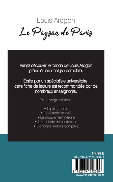 Venez découvrir Le Paysan de Paris de Louis Aragon grâce à une analyse littéraire de référence ! Écrite par un spécialiste universitaire, cette fiche de lecture est recommandée par de nombreux enseignants. Cet ouvrage contient la biographie de l'écrivain, le résumé détaillé, le mouvement littéraire, le contexte de publication de l'oeuvre et l'analyse complète. Retrouvez tous nos titres sur : www.fichedelecture.fr.