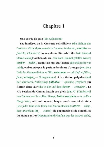 Le Silence du projecteur - Das Schweigen des ProjektorsEin atemberaubender Thriller vom Filmfestival in CannesTauchen Sie ein in die schillernde Welt des Cannes Filmfestivals, wo Glamour und dunkle Geheimnisse Hand in Hand gehen. Als der renommierte Regisseur Victor Lefort tot aufgefunden wird, steht das Festival Kopf. Inspektor Flavien Delorme und die ehrgeizige Journalistin Margot Pelletier werden in einen Strudel aus Intrigen, Leidenschaft und Verrat gezogen.Was verbirgt Leforts letzter Film? Warum musste der Regisseur sterben? Und wem kann man in einer Welt trauen, in der jeder eine Rolle spielt?Folgen Sie Delorme und Pelletier auf ihrer rasanten Jagd nach der Wahrheit durch die Kulissen des berühmtesten Filmfestivals der Welt. Jede Entdeckung bringt sie der schockierenden Wahrheit näher - und in größere Gefahr.Ein fesselnder Kriminalroman, der die Grenzen zwischen Realität und Fiktion verwischt und Sie bis zur letzten Seite in Atem hält. "Le Silence du projecteur" ist ein Must-Read für alle Fans von atmosphärischen Thrillern und Liebhaber des französischen Kinos.Lassen Sie sich von der Magie und den Abgründen der Filmwelt verzaubern - aber Vorsicht: Nichts ist, wie es auf den ersten Blick scheint!Tauchen Sie ein in die erste packende Geschichte der "Les Mystères cinématographique" Serie und lassen Sie sich von der Brandung der Spannung mitreißen!Entdecken Sie eine effektive Methode zum Französischlernen mit unserer Reihe "Frank-Lesemethode: Moderne Lektüre A2-B1"! Diese innovative Sammlung bietet Texte, die ursprünglich für B2-Niveau verfasst und dann speziell für A2-B1 Lernende aufbereitet wurden.Besonderheiten der Reihe: - Ursprünglich für B2-Niveau geschriebene, spannende Geschichten - Sorgfältig für A2-B1 Lernende angepasst, ohne den Text zu kürzen - Zweisprachige Texte mit nahtlos integrierter Unterstützung: - Französischer Originaltext - Deutsche Übersetzung und Erklärungen direkt im Text in Klammern - Übersetzung und Kommentare fügen sich natürlich in den Lesefluss ein - Reichhaltiger B2-Wortschatz, zugänglich gemacht für A2-B1 NiveauVorteile dieser Methode für A2-B1 Lernende: - Zugang zu authentischen B2-Texten ohne Überforderung - Erweiterung des Wortschatzes und der Grammatikkenntnisse im Kontext - Verbesserung des Leseverständnisses durch gezielte Unterstützung - Steigerung der Motivation durch Bewältigung anspruchsvoller TexteJedes Buch ermöglicht Ihnen: - Ihr Leseverständnis mit vollständigen B2-Texten zu verbessern - Ihren Wortschatz deutlich über das A2-B1 Niveau hinaus zu erweitern - Komplexere grammatikalische Strukturen in einem verständlichen Kontext kennenzulernen - Tiefere Einblicke in die französische Kultur zu gewinnenPerfekt für: - A2-B1 Lernende, die ihr Französisch effektiv verbessern möchten - Französischlernende, die von authentischen Texten profitieren wollen - Leser, die unterhaltsame und zugleich lehrreiche Lektüre suchenDiese Reihe bietet Ihnen die einzigartige Möglichkeit, vollständige Texte auf B2-Niveau zu lesen, die speziell für Ihr Lernniveau aufbereitet wurden. Erleben Sie, wie Sie mit jedem Buch Ihre Französischkenntnisse spürbar verbessern!Innovative Lesemethode: https://easyoriginal.com/lesemethode