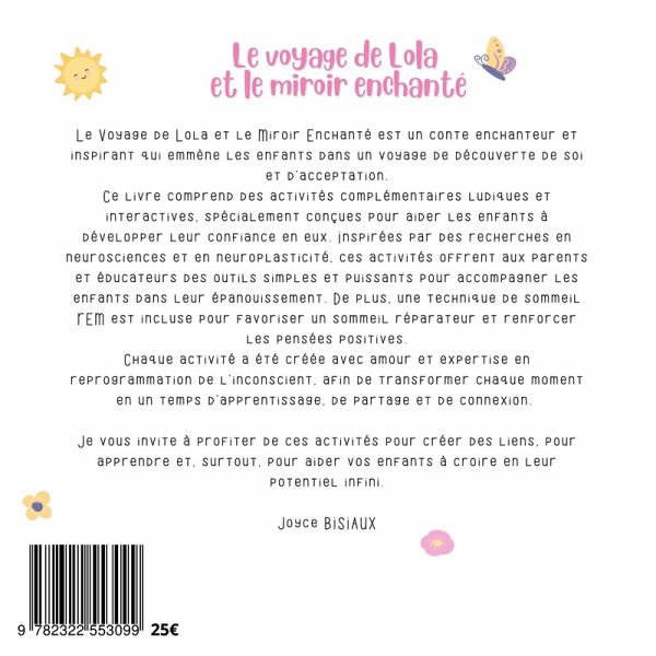 Le Voyage de Lola et le Miroir Enchanté est un conte enchanteur et inspirant qui emmène les enfants dans un voyage de découverte de soi et d'acceptation. Accompagnez Lola, une petite éléphante qui se sent peu sûre d'elle à cause de son apparence, alors qu'elle découvre un miroir magique qui révèle la véritable beauté qui se trouve en elle. À travers un langage simple et captivant, les enfants sont encouragés à reconnaître leur valeur intérieure et à s'aimer tels qu'ils sont. Ce livre comprend des activités complémentaires ludiques et interactives, spécialement conçues pour aider les enfants à développer leur confiance en eux. Inspirées par des recherches en neurosciences et en neuroplasticité, ces activités offrent aux parents et éducateurs des outils simples et puissants pour accompagner les enfants dans leur découverte de soi. De plus, une technique de reprogrammation par le sommeil REM est incluse pour favoriser un sommeil réparateur et renforcer les pensées positives. Je vous invite à profiter de chacune de ces activités comme une occasion de créer des liens, d'apprendre et, surtout, d'aider vos enfants à croire en leur potentiel infini.