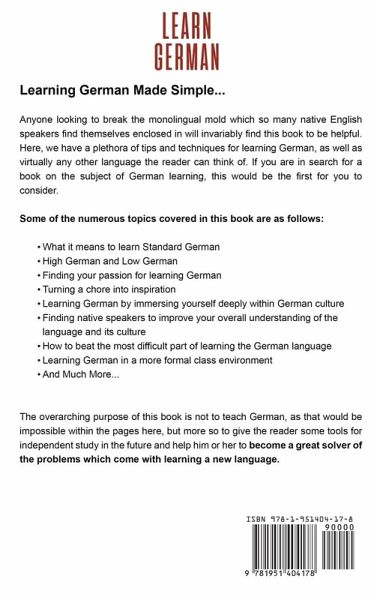 Learning German Made Easy... Anyone looking to break the monolingual mold which so many native English speakers find themselves enclosed in will invariably find this book to be helpful. Here, we have a plethora of tips and techniques for learning German, as well as virtually any other language the reader can think of. If you are in search for a book on the subject of German learning, this would be the first for you to consider. Some of the numerous topics covered in this book are as follows: * What it means to learn Standard German * High German and Low German * Finding your passion for learning German * Turning a chore into inspiration * Learning German by immersing yourself deeply within German culture * Finding native speakers to improve your overall understanding of the language and its culture * How to beat the most difficult part of learning the German language * Learning German in a more formal class environment * And Much More... This is just a general outline though, this book more specifically covers study techniques applicable to any field, the culture of Germany as well as the rest of German speaking Europe, some of the history of the language and its various dialects, steps for beginning the study of the language, and learning German inside (and outside) of formal class settings. All these topics covered should coalesce into something of value to the reader which can be carried over and utilized by him or her in the future. The overarching purpose of this book is not to teach German, as that would be impossible within the pages here, but more so to give the reader some tools for independent study in the future and help him or her to become a great solver of the problems which come with learning a new language. Don’t wait another moment to enjoy from this information – Get your copy of Learn German right away!