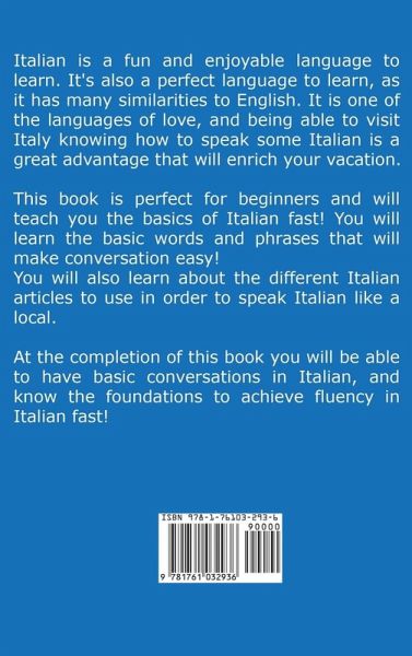 LEARN ITALIAN Italian is a fun and enjoyable language to learn. It's also a perfect language to learn, as it has many similarities to English. It is one of the languages of love, and being able to visit Italy knowing how to speak some Italian is a great advantage that will enrich your vacation. This book is perfect for beginners and will teach you the basics of Italian fast! You will learn the basic words and phrases that will make conversation easy! You will also learn about the different Italian articles to use in order to speak Italian like a local. At the completion of this book you will be able to have basic conversations in Italian, and know the foundations to achieve fluency in Italian fast! Here Is What You'll Learn About... Italian Alphabet Italian Pronunciation Basic Words Useful & Common Phrases Italian Articles Grammar Rules Much, Much More!