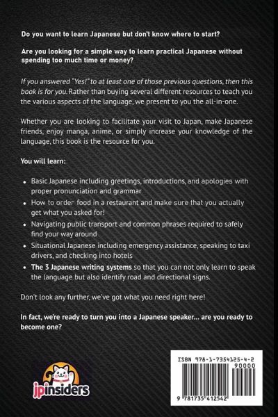 Are you ready to start speaking, writing, and understanding Japanese in minutes?Are you planning to travel to Japan but are worried about the language barrier? If you answer "Yes!" to the previous questions, then this book is for you. Rather than buying several different resources to teach you the various aspects of the language, we present to you the all-in-one. This is the ultimate starting point for any beginner! You will learn...How to study: Tips and tricks on how to study and what to study to learn and retain the language quickly. Basic Japanese vocabulary: You'll learn useful conversational phrases and the basics of Japanese so that you can introduce yourself and ask questions. The Japanese pronunciation: You'll learn the ins and outs of perfect Japanese pronunciation. You'll learn the common mistakes learners make, how to avoid them, and the nuances that only native speakers know. The 3 Japanese writing systems so that you can not only learn to speak the language but also identify road and directional signs. In fact, we're ready to turn you into a Japanese speaker... are you ready to become one? Get a copy of this book now!